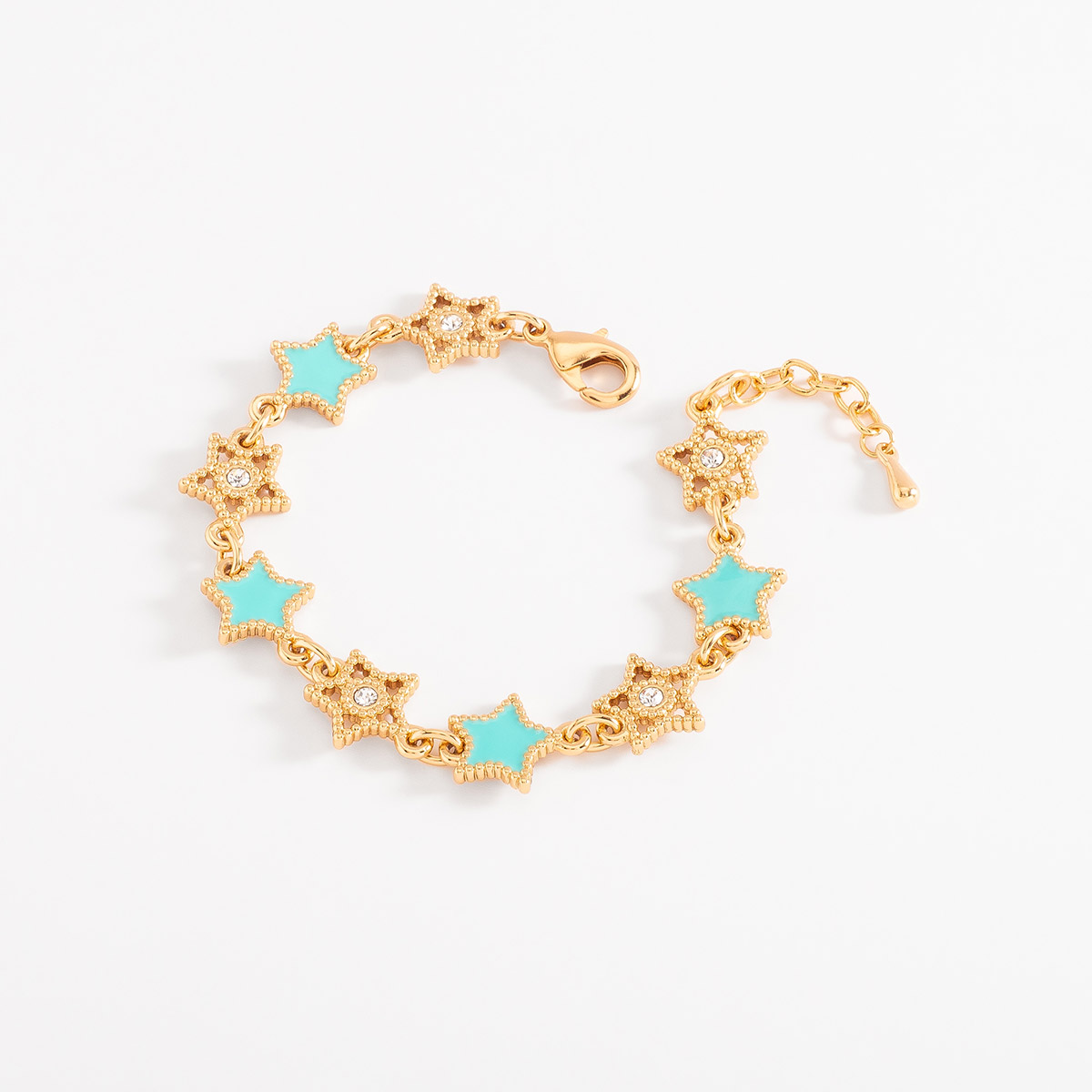Pulsera en baño de oro con pequeñas estrellas alternadas en esmalte color turquesa y otras con una piedra tono cristal al centro. Un diseño alegre y femenino que llena tu look de brillo y color.